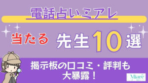 ![]() 電話占いミアレ | 2022年6月 | なし | 1分275円~ | 相談者負担 | ・銀行振込 ・クレジットカード決済 ・コンビニ決済 | 公式サイト | |