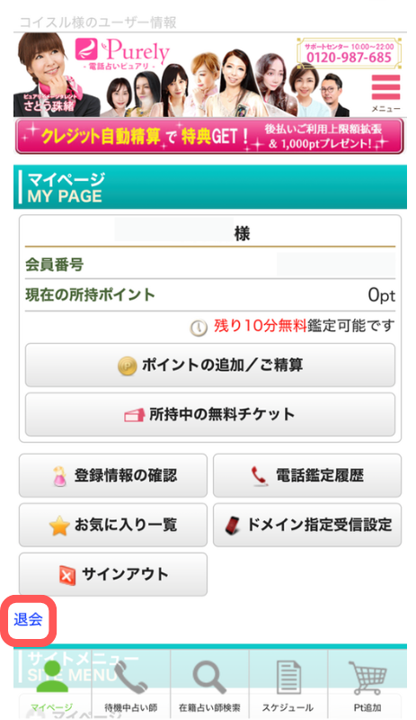 電話占いピュアリでは、鑑定を一度も受けていない場合のみ、マイページから退会・解約ができます。